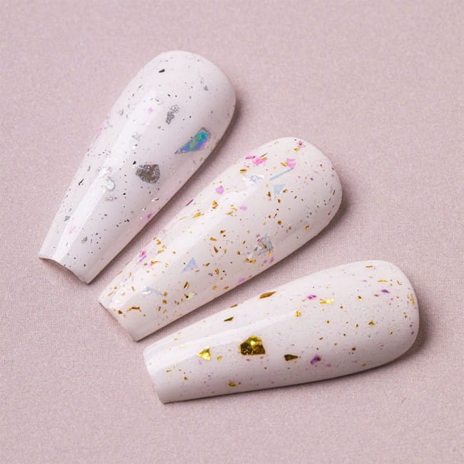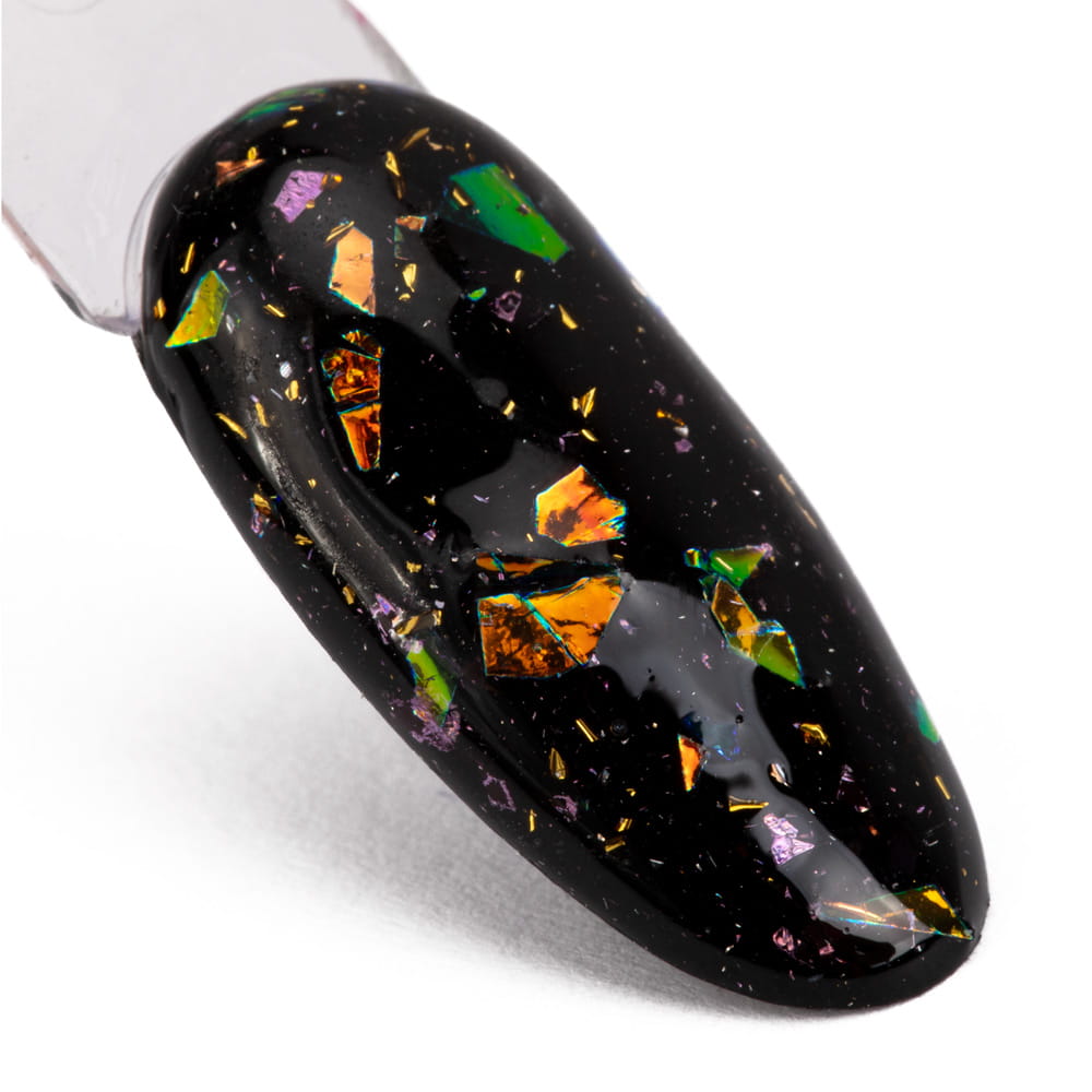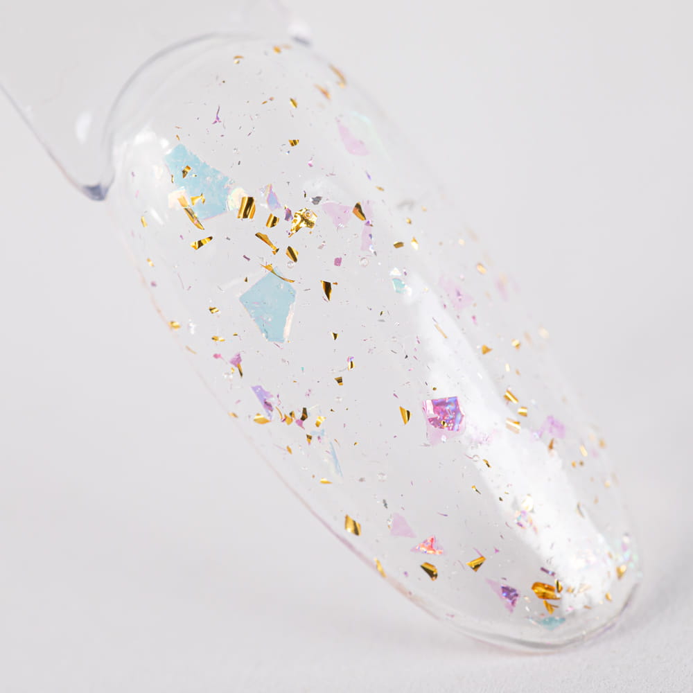 Jego nieregularne drobinki mienią się holograficznym blaskiem, przyciągając wzrok dzięki odbijaniu światła w różnorodnych odcieniach. Dzięki temu efektowi doskonale sprawdzi się zarówno w stylizacjach nude, jak i w tzw. "princess nails", gdy jest aplikowany przy skórkach i pokryty warstwą półtransparentnego żelu lub bazy. VuittonLac
